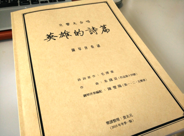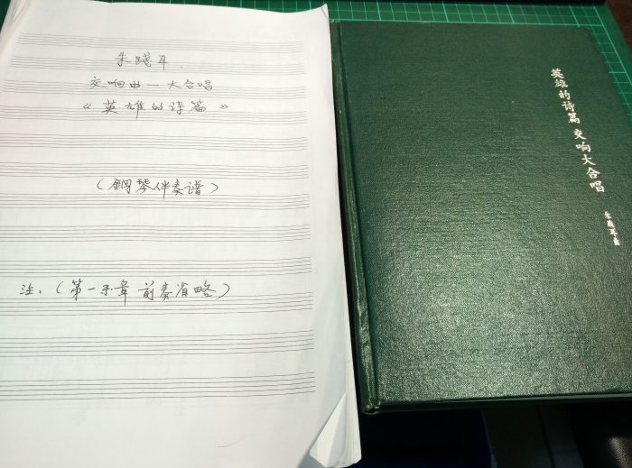 又說回2015年上海的演出,雖然我當時無法前往觀看,但是有一位學習聲樂的朋友,竟然幫我拿到一份合唱團使用的排練譜!這份樂譜有些混亂,一部份是早期油印的痕跡,一部份是陳燮陽補充的鋼琴伴奏段落,但並不完整,缺失一些前奏與間奏。也不知是何種緣份,也在那時,我從孔夫子舊書網上,購得一本綠皮油印的《英雄的詩篇》鋼琴伴奏譜,但顯然是比較早期的版本,缺失了現今的男低音獨唱第五樂章,結構也與最終版本有所差異。後來,我把這兩份譜稿加以整理,並且依照《朱踐耳管弦樂曲集》收錄的總譜手稿,將完整的《英雄的詩篇》鋼琴伴奏譜稿整理出來。《橄欖古典音樂》主編替我去採訪朱先生時,也將我整理好的譜稿打印裝訂,請他簽字過目,留存紀念。