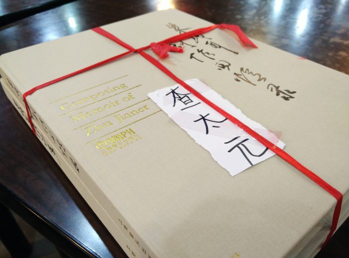 我與金教授約在臺北一處咖啡廳見面,金教授帶了《朱踐耳創作回憶錄》及朱先生一封親筆信給我,朱先生還將書籍用紅色緞帶打結,以示鄭重。朱先生在信中寫道: